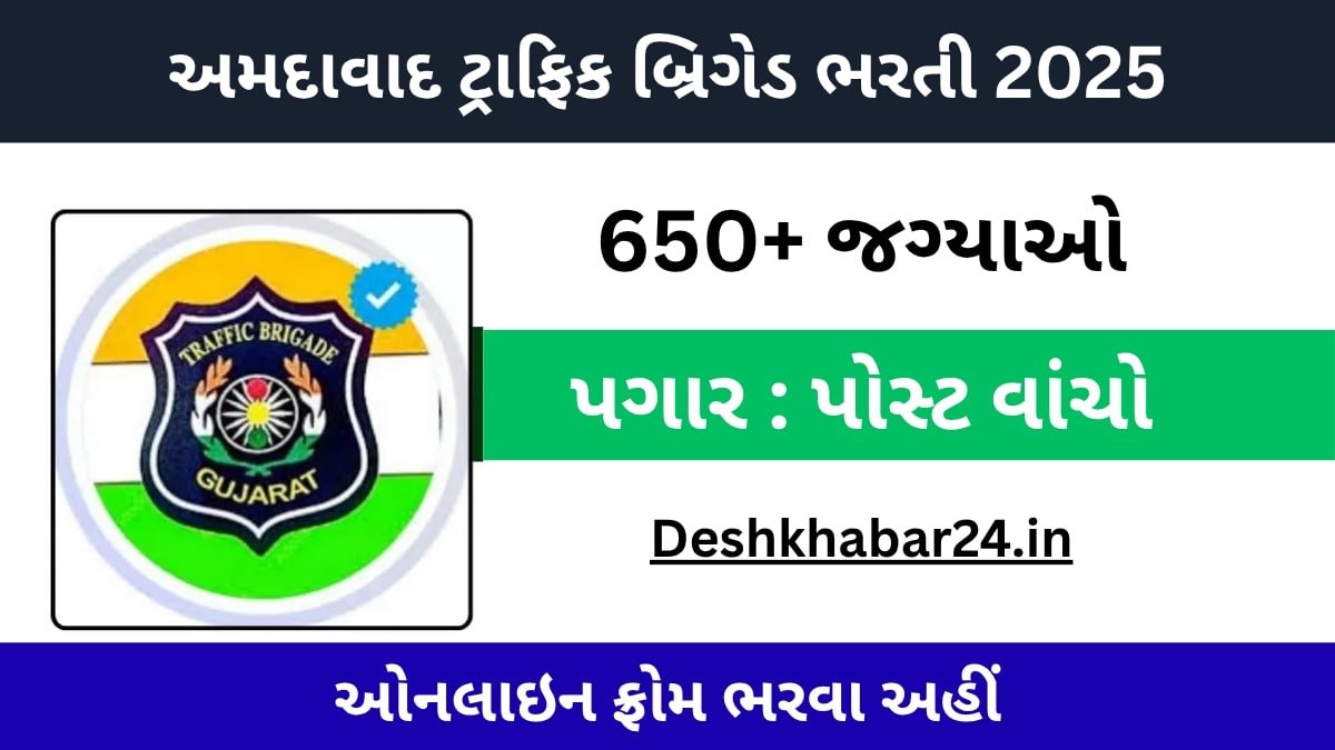 અમદાવાદ ટ્રાફિક બ્રિગેડ ભરતી 2025 શરૂ થઈ ગઈ છે — જેમાં 650 થી વધુ જગ્યાઓ ઉપલબ્ધ છે અને ખાસ વાત એ છે કે ફક્ત 9મી પાસ ઉમેદવાર પણ અરજી કરી શકે છે.